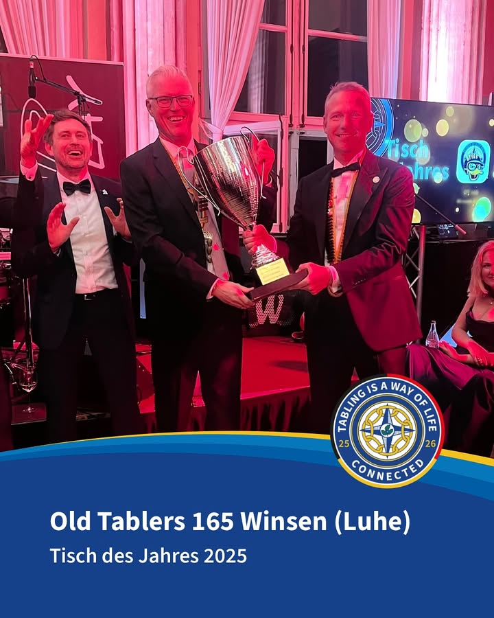 Die Verleihung „Tisch des Jahres“ fand erstmals beim Half Year Meeting von Old Tablers Deutschland in Celle statt. Präsident Dr. Matthias Hardinghaus überreichte die Ehrung, während Jens Deward als Distriktspräsident die Laudatio hielt.